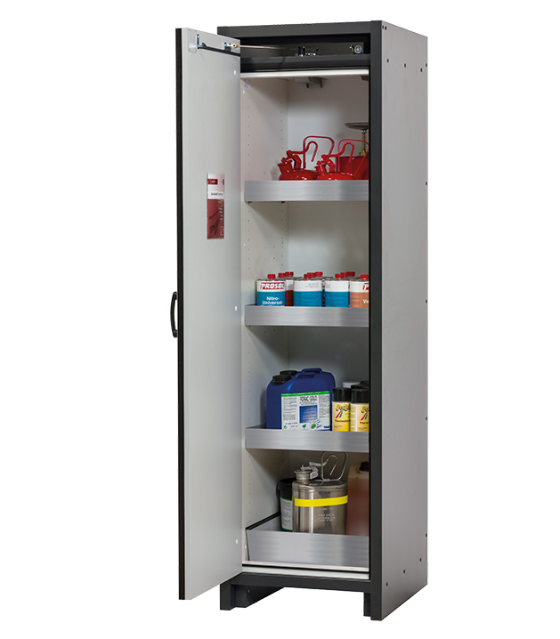 color del cuerpo gris antracita, con puerta batiente en asecos plata, equipamiento interior con 3 x bandeja tipo cubeta (acero inox. 1.4301), 1 x bandeja perforada (acero inoxidable 1.4016), 1 x cubeto de retención (acero inox. 1.4301)
