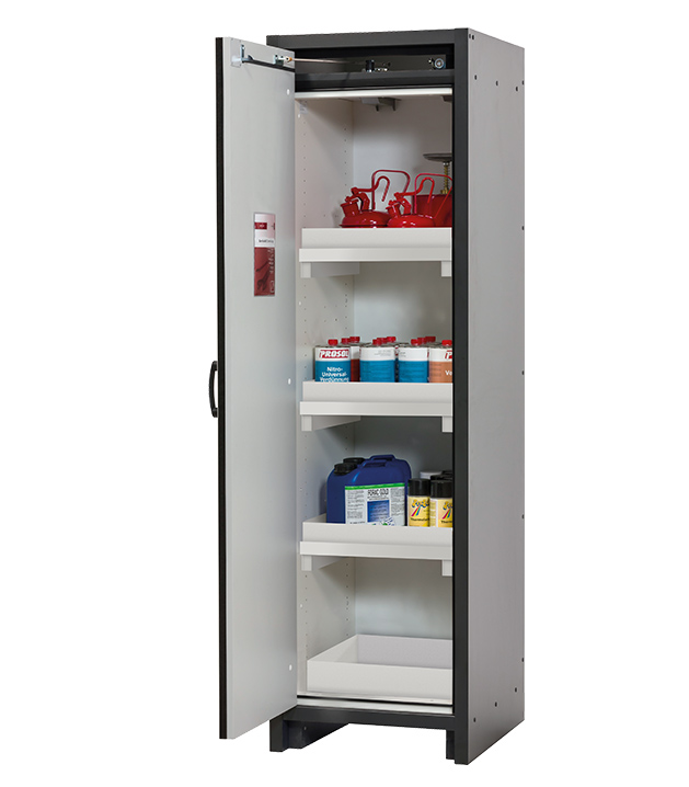 color del cuerpo gris antracita, con puerta batiente en blanco puro (RAL 9010), equipamiento interior con 3 x bandeja tipo cubeta, 1 x cubeto de retención (PP)