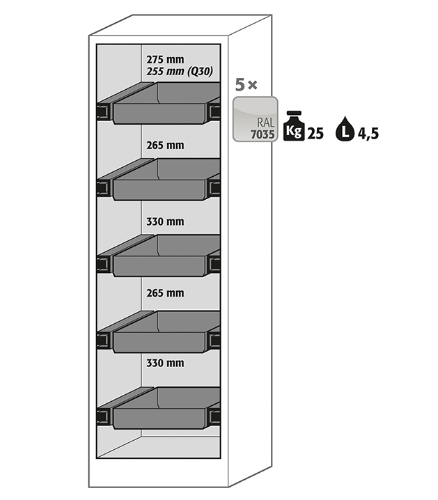 color del cuerpo gris antracita, con puerta batiente en blanco puro (RAL 9010), equipamiento interior con 5 x cajón extraíble (plancha de acero recubrimiento plástico)