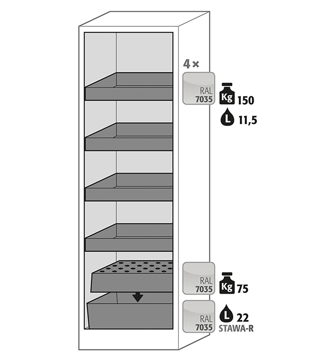 color del cuerpo gris antracita, con puerta batiente en gris claro (RAL 7035), equipamiento interior con 4 x bandeja tipo cubeta, 1 x bandeja perforada, 1 x cubeto de retención (plancha de acero recubrimiento plástico)
