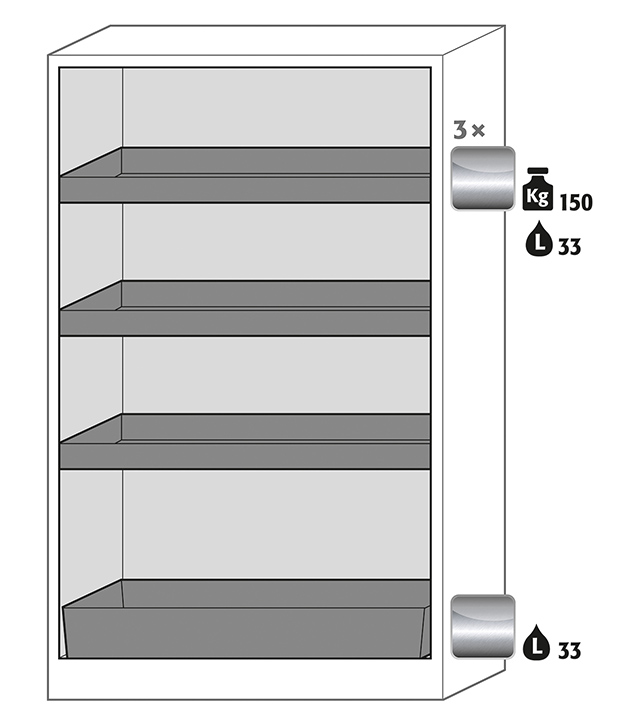 color del cuerpo gris antracita (RAL 7016), con puertas batientes en amarillo seguridad (RAL 1004), equipamiento interior con 3 x bandeja tipo cubeta, 1 x cubeto de retención (acero inoxidable 1.4016)