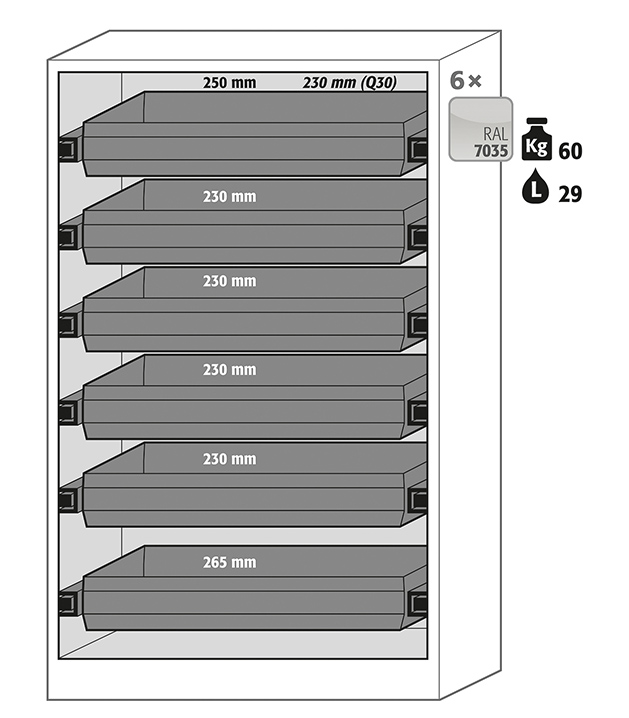 color del cuerpo gris antracita (RAL 7016), con puertas batientes en rojo tráfico (RAL 3020), equipamiento interior con 6 x cajón extraíble (acero inox. 1.4301)