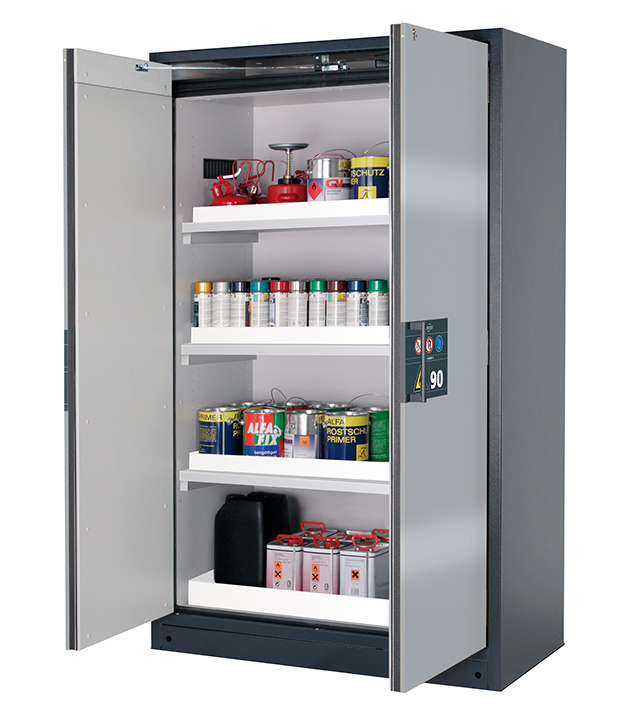 color del cuerpo gris antracita (RAL 7016), con puertas batientes en asecos plata, equipamiento interior con 3 x bandeja tipo cubeta, 1 x cubeto de retención (PP)