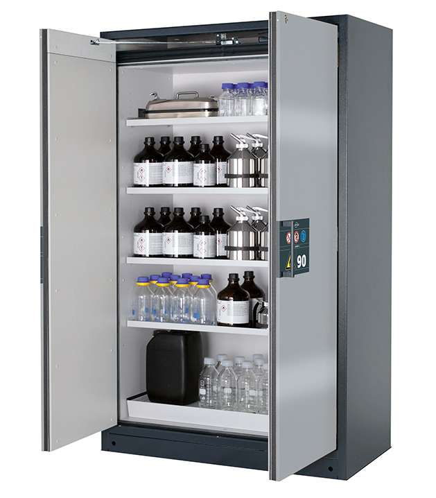color del cuerpo gris antracita (RAL 7016), con puertas batientes en asecos plata, equipamiento interior con 4 x bandeja, 1 x bandeja perforada, 1 x cubeto de retención (plancha de acero recubrimiento plástico)