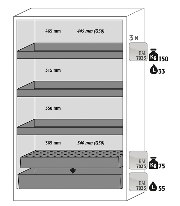 color del cuerpo gris antracita (RAL 7016), con puertas batientes en asecos plata, equipamiento interior con 3 x bandeja tipo cubeta, 1 x bandeja perforada, 1 x cubeto de retención (plancha de acero recubrimiento plástico)