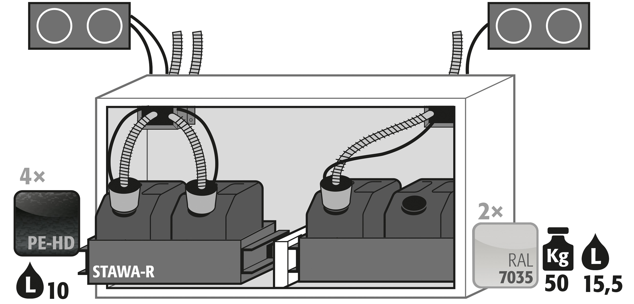 - Ventilación: Conductos de ventilación integrados listos para conexión (DN50) a un sistema de ventilación, opcionalmente con monitoreo de aire de extracción