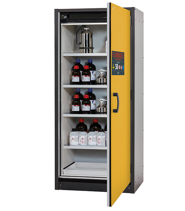 color del cuerpo gris antracita, con puerta batiente en amarillo seguridad (RAL 1004), equipamiento interior con 4 x bandeja, 1 x cubeto de retención (plancha de acero recubrimiento plástico)