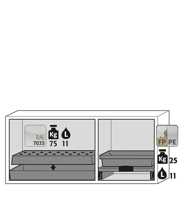 gris claro (RAL 7035), equipamiento interior con 1 x bandeja perforada, 1 x cubeto de retención (plancha de acero recubrimiento plástico), 1 x cajón extraíble (melamina/PP endurecida)