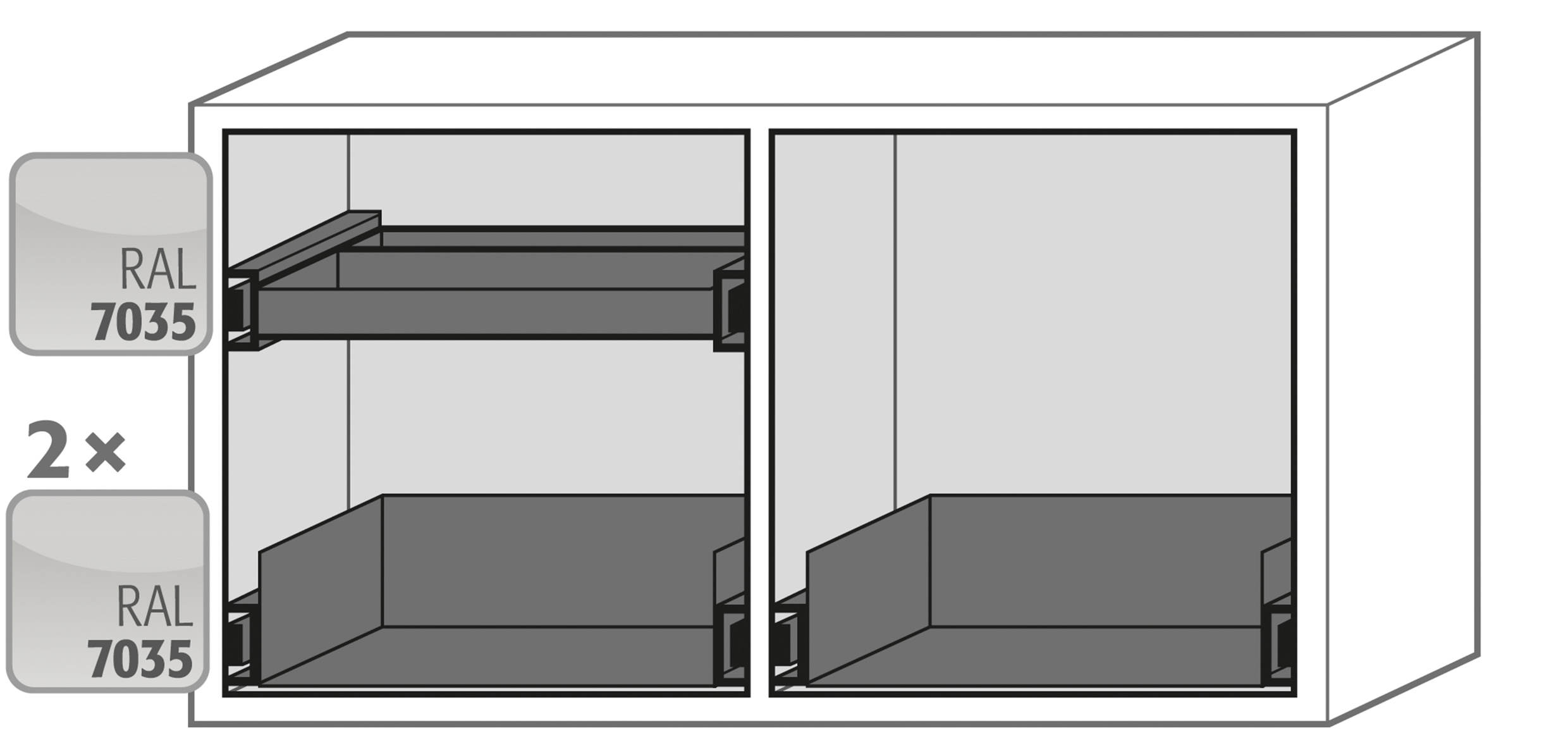 gris claro (RAL 7035), equipamiento interior con 2 x cajón, 1 x cajón 2º nivel (plancha de acero recubrimiento plástico)
