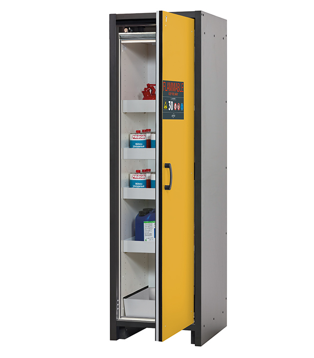 color del cuerpo gris antracita, con puerta batiente en amarillo seguridad (RAL 1004), equipamiento interior con 4 x bandeja tipo cubeta, 1 x cubeto de retención (plancha de acero recubrimiento plástico)