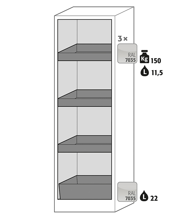 color del cuerpo gris antracita, con puerta batiente en gris claro (RAL 7035), equipamiento interior con 3 x bandeja tipo cubeta, 1 x cubeto de retención (plancha de acero recubrimiento plástico)