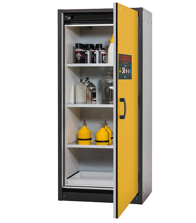 color del cuerpo gris antracita, con puerta batiente en amarillo seguridad (RAL 1004), equipamiento interior con 3 x bandeja, 1 x cubeto de retención (plancha de acero recubrimiento plástico)