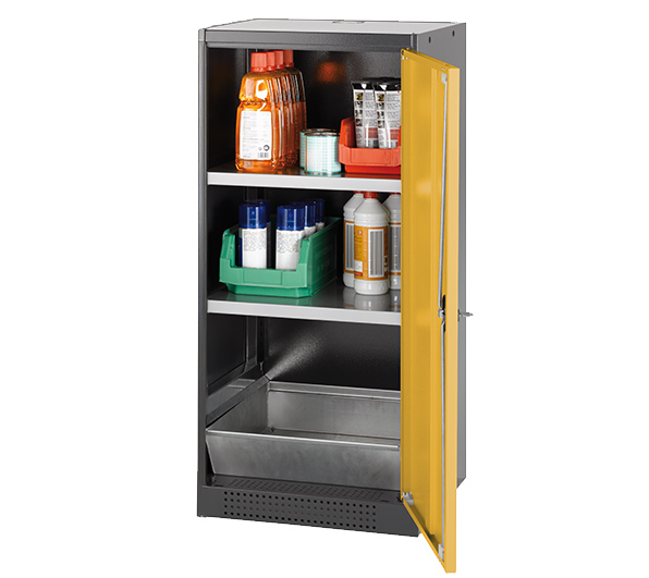 color del cuerpo gris antracita (RAL 7016), con puerta batiente en amarillo seguridad (RAL 1004), equipamiento interior con 2 x bandeja, 1 x cubeto de retención (plancha de acero recubrimiento galvanizado)