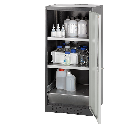 color del cuerpo gris antracita (RAL 7016), con puerta batiente en gris claro (RAL 7035), equipamiento interior con 2 x bandeja, 1 x bandeja perforada, 1 x cubeto de retención (plancha de acero recubrimiento galvanizado)