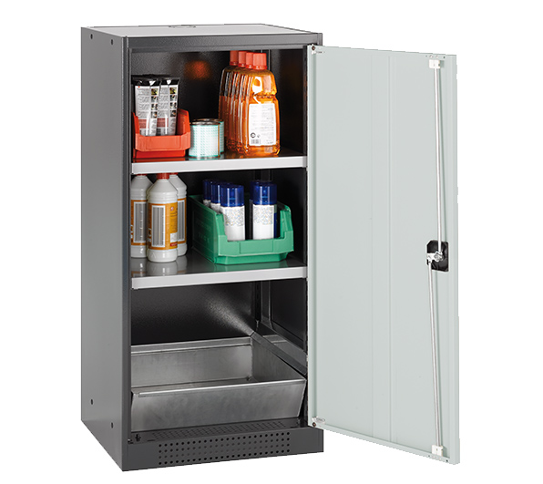 color del cuerpo gris antracita (RAL 7016), con puerta batiente en gris claro (RAL 7035), equipamiento interior con 2 x bandeja, 1 x cubeto de retención (plancha de acero recubrimiento galvanizado)