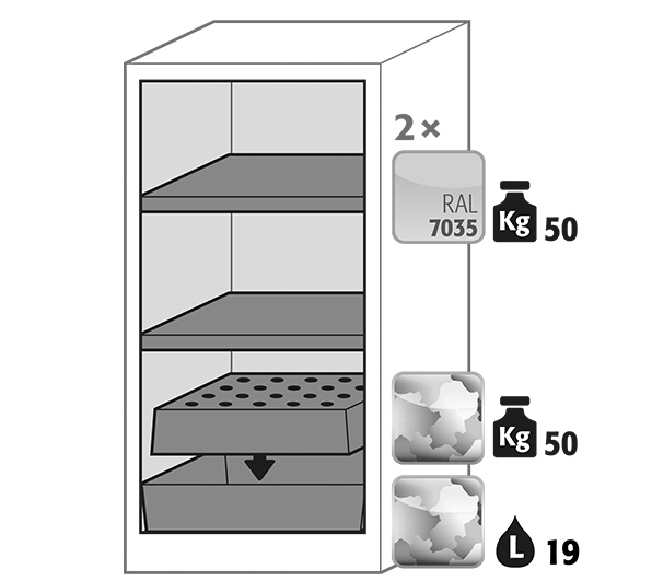color del cuerpo gris antracita (RAL 7016), con puerta batiente en gris claro (RAL 7035), equipamiento interior con 2 x bandeja, 1 x bandeja perforada, 1 x cubeto de retención (plancha de acero recubrimiento galvanizado)