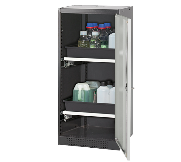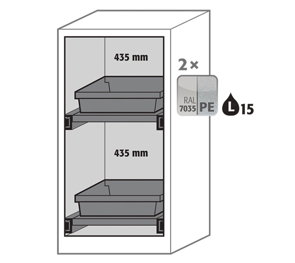color del cuerpo gris antracita (RAL 7016), con puerta batiente en gris claro (RAL 7035), equipamiento interior con 2 x cajón extraíble (plancha de acero/PP recubrimiento plástico)