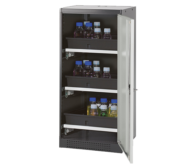 color del cuerpo gris antracita (RAL 7016), con puerta batiente en gris claro (RAL 7035), equipamiento interior con 3 x cajón extraíble (plancha de acero/PP recubrimiento plástico)