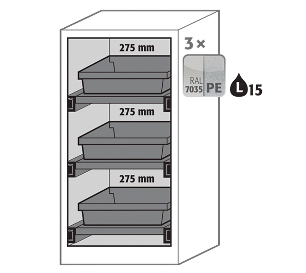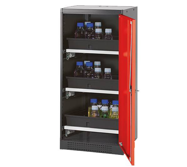 color del cuerpo gris antracita (RAL 7016), con puerta batiente en rojo tráfico (RAL 3020), equipamiento interior con 3 x cajón extraíble (plancha de acero/PP recubrimiento plástico)