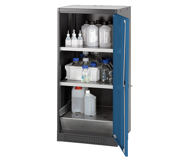 color del cuerpo gris antracita (RAL 7016), con puerta batiente en azul genciana (RAL 5010), equipamiento interior con 2 x bandeja, 1 x bandeja perforada, 1 x cubeto de retención (plancha de acero recubrimiento galvanizado)