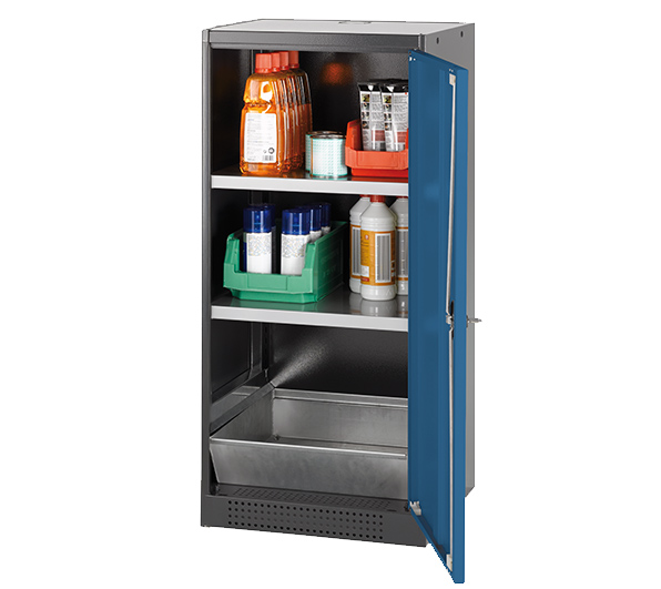 color del cuerpo gris antracita (RAL 7016), con puerta batiente en azul genciana (RAL 5010), equipamiento interior con 2 x bandeja, 1 x cubeto de retención (plancha de acero recubrimiento galvanizado)
