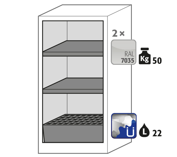 color del cuerpo gris antracita (RAL 7016), con puerta batiente en azul genciana (RAL 5010), equipamiento interior con 2 x bandeja, 1 x cubeto de retención con rejilla (plancha de acero recubrimiento galvanizado y lacado)