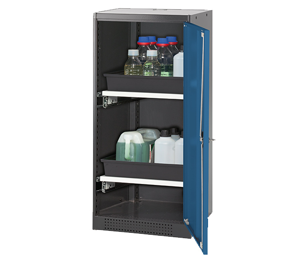 color del cuerpo gris antracita (RAL 7016), con puerta batiente en azul genciana (RAL 5010), equipamiento interior con 2 x cajón extraíble (plancha de acero/PP recubrimiento plástico)