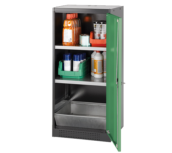 color del cuerpo gris antracita (RAL 7016), con puerta batiente en verde reseda (RAL 6011), equipamiento interior con 2 x bandeja, 1 x cubeto de retención (plancha de acero recubrimiento galvanizado)
