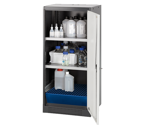 color del cuerpo gris antracita (RAL 7016), con puerta batiente en asecos plata, equipamiento interior con 2 x bandeja, 1 x cubeto de retención con rejilla (plancha de acero recubrimiento galvanizado y lacado)