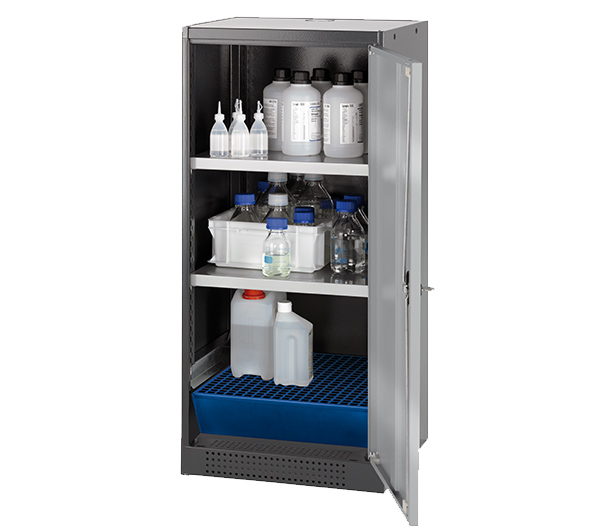 color del cuerpo gris antracita (RAL 7016), con puerta batiente en asecos plata, equipamiento interior con 2 x bandeja, 1 x cubeto de retención con rejilla (plancha de acero recubrimiento galvanizado y lacado)