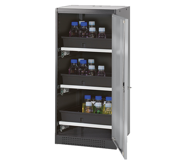 color del cuerpo gris antracita (RAL 7016), con puerta batiente en asecos plata, equipamiento interior con 3 x cajón extraíble (plancha de acero/PP recubrimiento plástico)