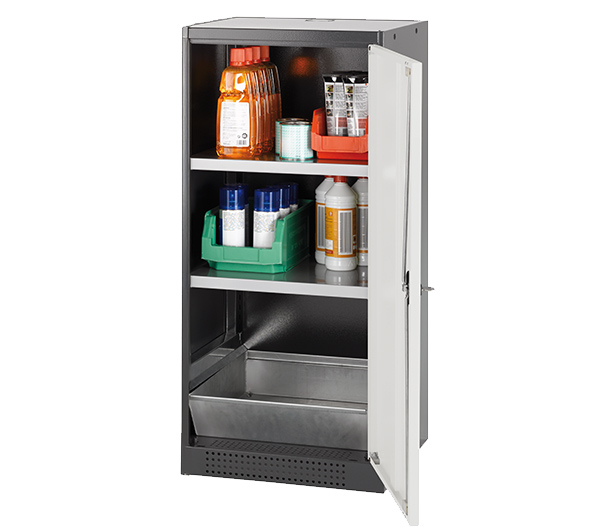 color del cuerpo gris antracita (RAL 7016), con puerta batiente en blanco puro (RAL 9010), equipamiento interior con 2 x bandeja, 1 x cubeto de retención (plancha de acero recubrimiento galvanizado)