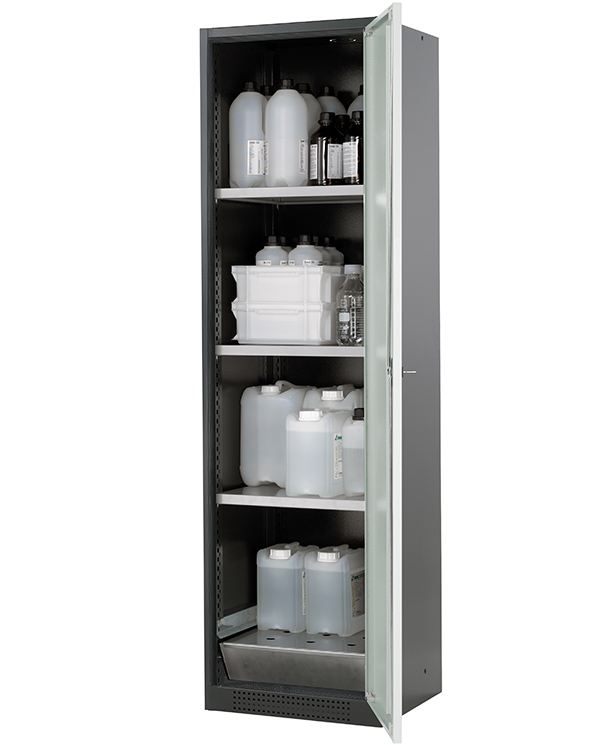 color del cuerpo gris antracita (RAL 7016), con puerta batiente en gris claro (RAL 7035), equipamiento interior con 3 x bandeja, 1 x bandeja perforada, 1 x cubeto de retención (plancha de acero recubrimiento galvanizado)