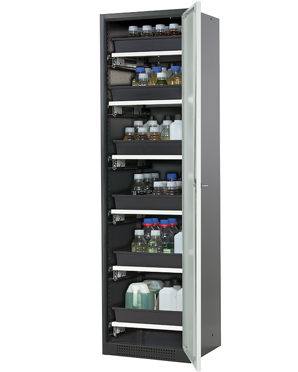 color del cuerpo gris antracita (RAL 7016), con puerta batiente en gris claro (RAL 7035), equipamiento interior con 6 x cajón extraíble (plancha de acero/PP recubrimiento plástico)