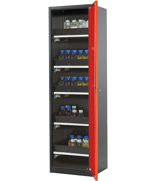 color del cuerpo gris antracita (RAL 7016), con puerta batiente en rojo tráfico (RAL 3020), equipamiento interior con 5 x cajón extraíble (plancha de acero/PP recubrimiento plástico)