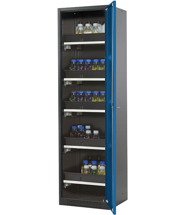 color del cuerpo gris antracita (RAL 7016), con puerta batiente en azul genciana (RAL 5010), equipamiento interior con 5 x cajón extraíble (plancha de acero/PP recubrimiento plástico)