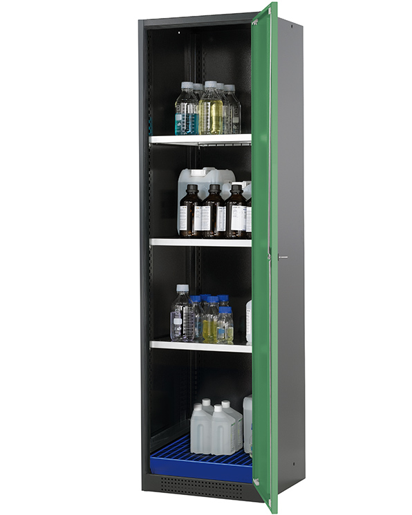 color del cuerpo gris antracita (RAL 7016), con puerta batiente en verde reseda (RAL 6011), equipamiento interior con 3 x bandeja, 1 x cubeto de retención con rejilla (plancha de acero recubrimiento galvanizado y lacado)