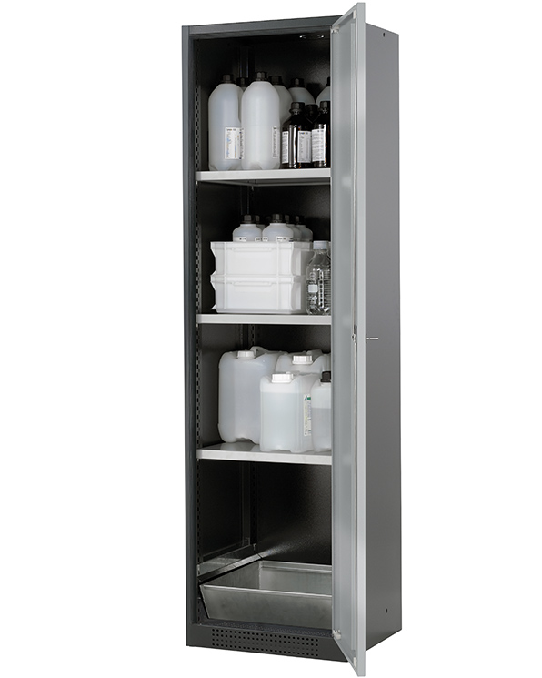 color del cuerpo gris antracita (RAL 7016), con puerta batiente en asecos plata, equipamiento interior con 3 x bandeja, 1 x cubeto de retención (plancha de acero recubrimiento galvanizado)