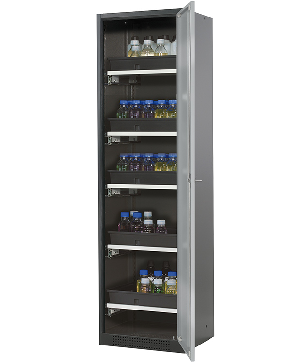 color del cuerpo gris antracita (RAL 7016), con puerta batiente en asecos plata, equipamiento interior con 5 x cajón extraíble (plancha de acero/PP recubrimiento plástico)