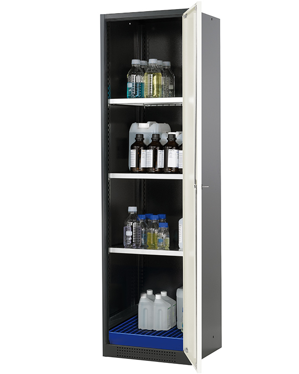 color del cuerpo gris antracita (RAL 7016), con puerta batiente en blanco puro (RAL 9010), equipamiento interior con 3 x bandeja, 1 x cubeto de retención con rejilla (plancha de acero recubrimiento galvanizado y lacado)
