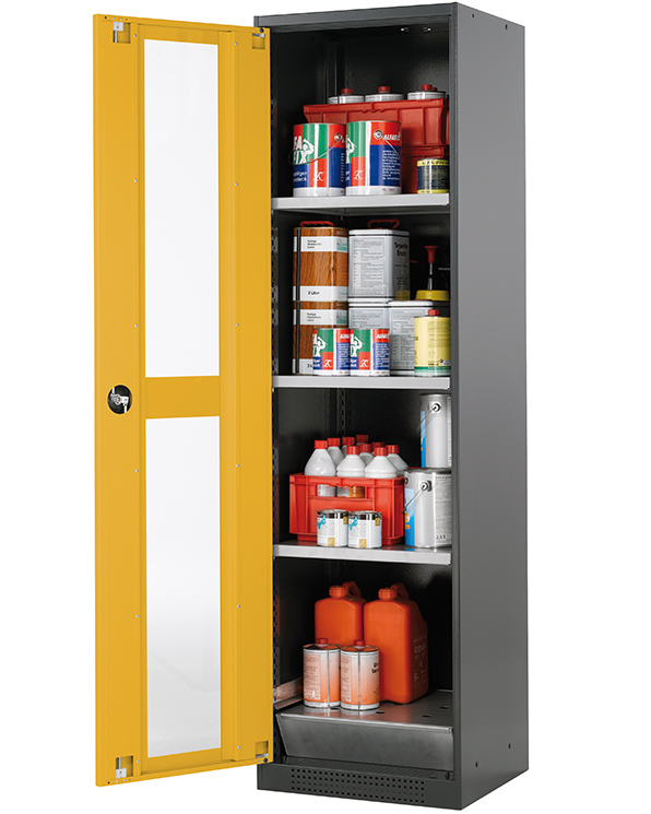 color del cuerpo gris antracita (RAL 7016), con puerta batiente con ventanas fijas en amarillo seguridad (RAL 1004), equipamiento interior con 3 x bandeja, 1 x bandeja perforada, 1 x cubeto de retención (plancha de acero recubrimiento galvanizado)