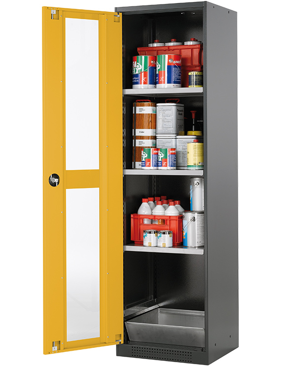 color del cuerpo gris antracita (RAL 7016), con puerta batiente con ventanas fijas en amarillo seguridad (RAL 1004), equipamiento interior con 3 x bandeja, 1 x cubeto de retención (plancha de acero recubrimiento galvanizado)