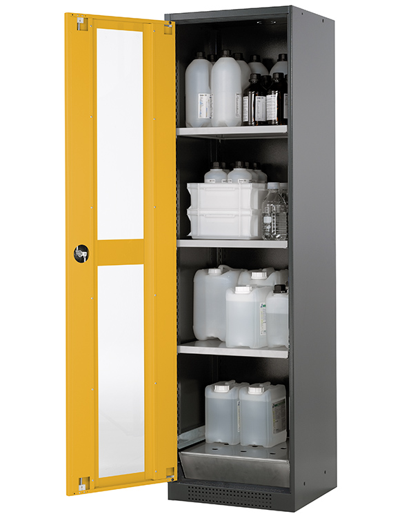 color del cuerpo gris antracita (RAL 7016), con puerta batiente con ventanas fijas en amarillo seguridad (RAL 1004), equipamiento interior con 3 x bandeja, 1 x bandeja perforada, 1 x cubeto de retención (plancha de acero recubrimiento galvanizado)