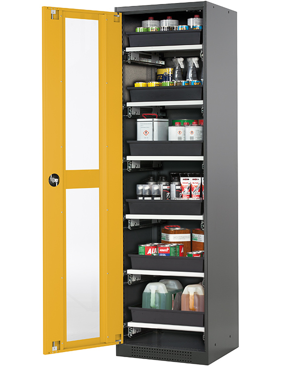 color del cuerpo gris antracita (RAL 7016), con puerta batiente con ventanas fijas en amarillo seguridad (RAL 1004), equipamiento interior con 6 x cajón extraíble (plancha de acero/PP recubrimiento plástico)