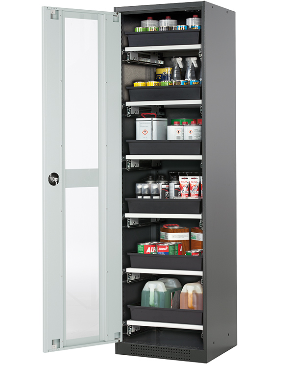 color del cuerpo gris antracita (RAL 7016), con puerta batiente con ventanas fijas en gris claro (RAL 7035), equipamiento interior con 6 x cajón extraíble (plancha de acero/PP recubrimiento plástico)