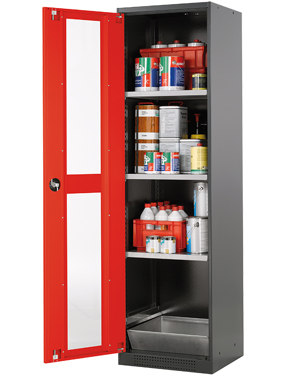 color del cuerpo gris antracita (RAL 7016), con puerta batiente con ventanas fijas en rojo tráfico (RAL 3020), equipamiento interior con 3 x bandeja, 1 x cubeto de retención (plancha de acero recubrimiento galvanizado)