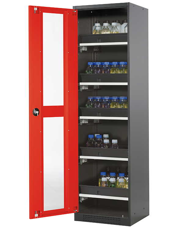 color del cuerpo gris antracita (RAL 7016), con puerta batiente con ventanas fijas en rojo tráfico (RAL 3020), equipamiento interior con 5 x cajón extraíble (plancha de acero/PP recubrimiento plástico)