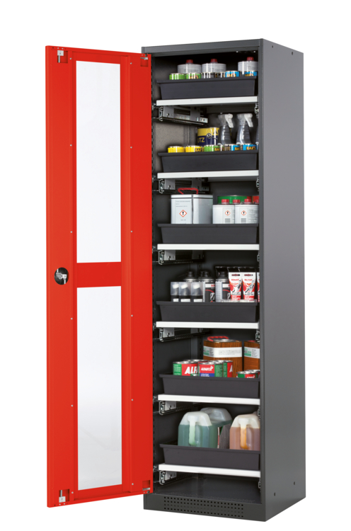 color del cuerpo gris antracita (RAL 7016), con puerta batiente con ventanas fijas en rojo tráfico (RAL 3020), equipamiento interior con 6 x cajón extraíble (plancha de acero/PP recubrimiento plástico)