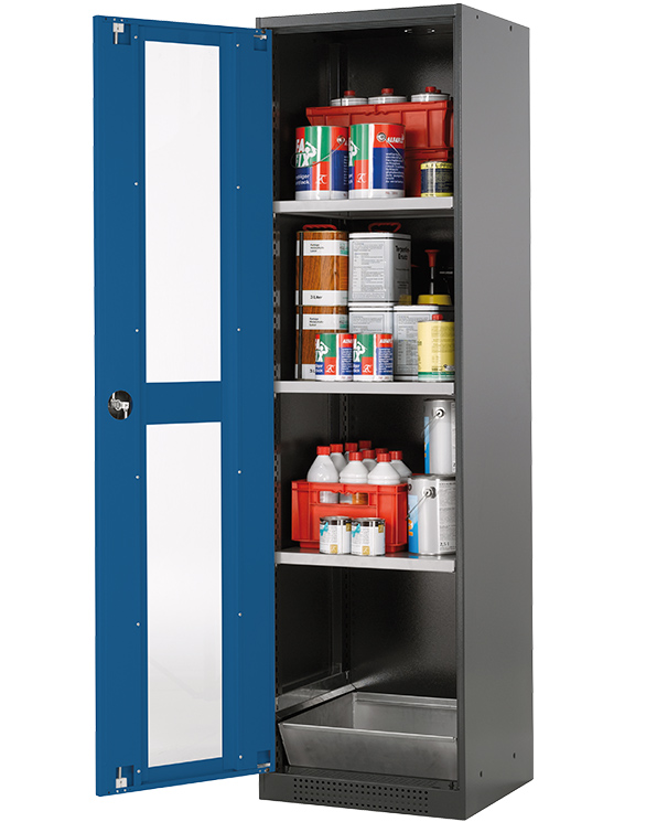 color del cuerpo gris antracita (RAL 7016), con puerta batiente con ventanas fijas en azul genciana (RAL 5010), equipamiento interior con 3 x bandeja, 1 x cubeto de retención (plancha de acero recubrimiento galvanizado)