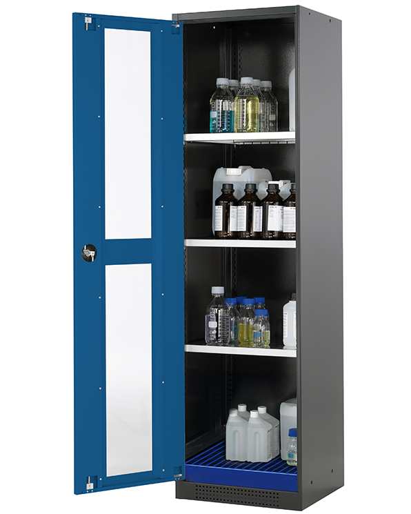 color del cuerpo gris antracita (RAL 7016), con puerta batiente con ventanas fijas en azul genciana (RAL 5010), equipamiento interior con 3 x bandeja, 1 x cubeto de retención con rejilla (plancha de acero recubrimiento galvanizado y lacado)